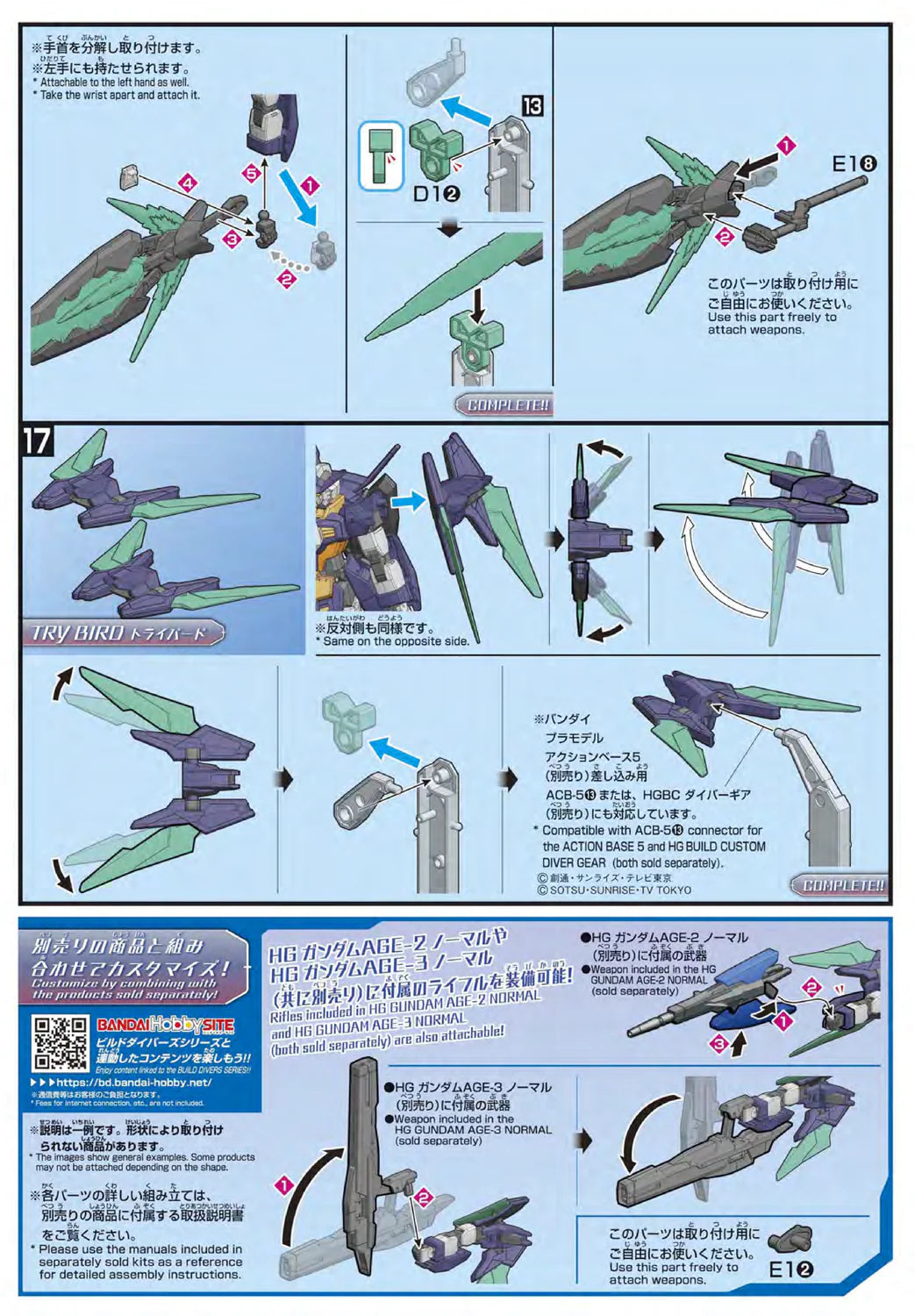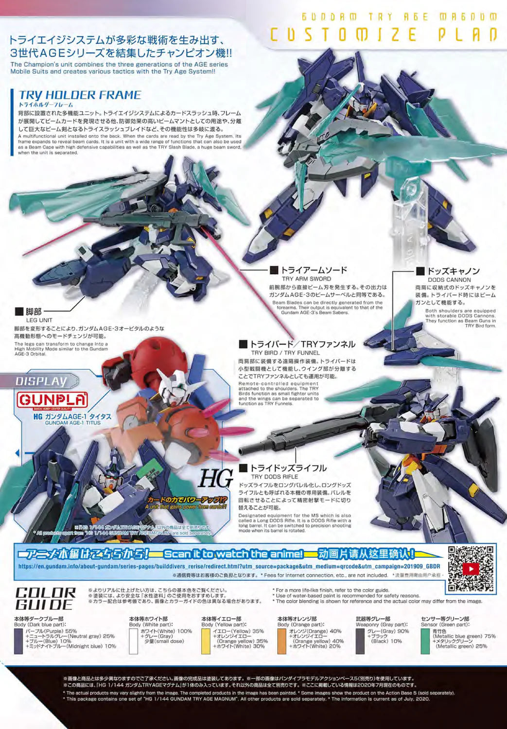 The Gundam with the power of Gundam AGE-1 through AGE-3 joins the 1/144 scale High Grade Build Divers Re:RISE model kit series! This set includes pieces to create its rifle and 2 beam sabers.
