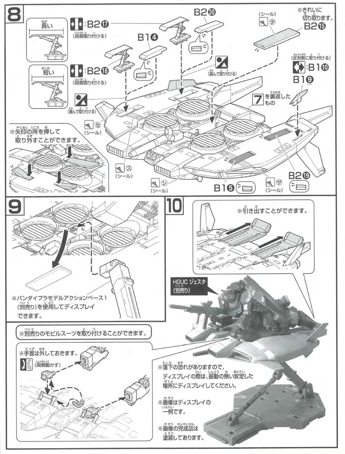 This E.F.S.F Sub Flight System, also known as the Base Jabber, consists of some very large (for an HGUC) parts but don't let that fool you. There's plenty of detail to be found. The Base Jabber is designed to work with a variety of 1/144 scale HG kits and even comes with foil marking stickers for extra detail. It is able to mount to a Bandai Action Base or can stand on its own thanks to included landing gear parts. Pictured on the box art is the 1/144 HGUC RGM-96X Jesta Gundam which is sold separately