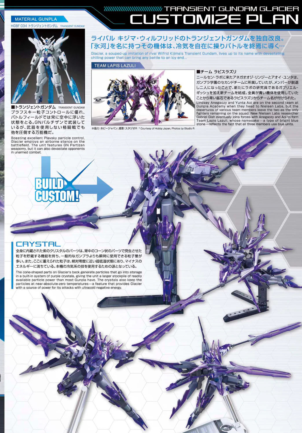 Based on Gundam Build Fighters Honoo, this model kit of the Transient Gundam Glacier is in 1/144 scale and becomes a fully articulated figure once built. The model kit features a purple and black color scheme and includes two giant lances.