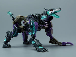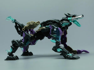 BeastBOX is an original series of robotic-style creatures that transform into cubes. The BB-31 Firmhand has a robotic wolf creature mode and features a black, purple, silver, and teal color scheme.
