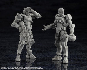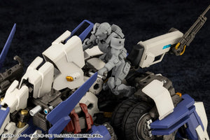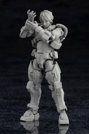 The model stands nearly 3 inches tall, features 43 points of articulation, and includes three types of heads, each with corresponding eye decals. The wrists have stable 2mm joints and the inner thighs have joints specially designed for riding HEXA GEAR, allowing for the model to become one with the HEXA GEAR while maintaining its human form. The included sword and rifle can be combined to create a bayonet, while the model is equipped with a connector on the back piece, which allows users to attach a HEXA G-R.A.M System and a variety of parts.
