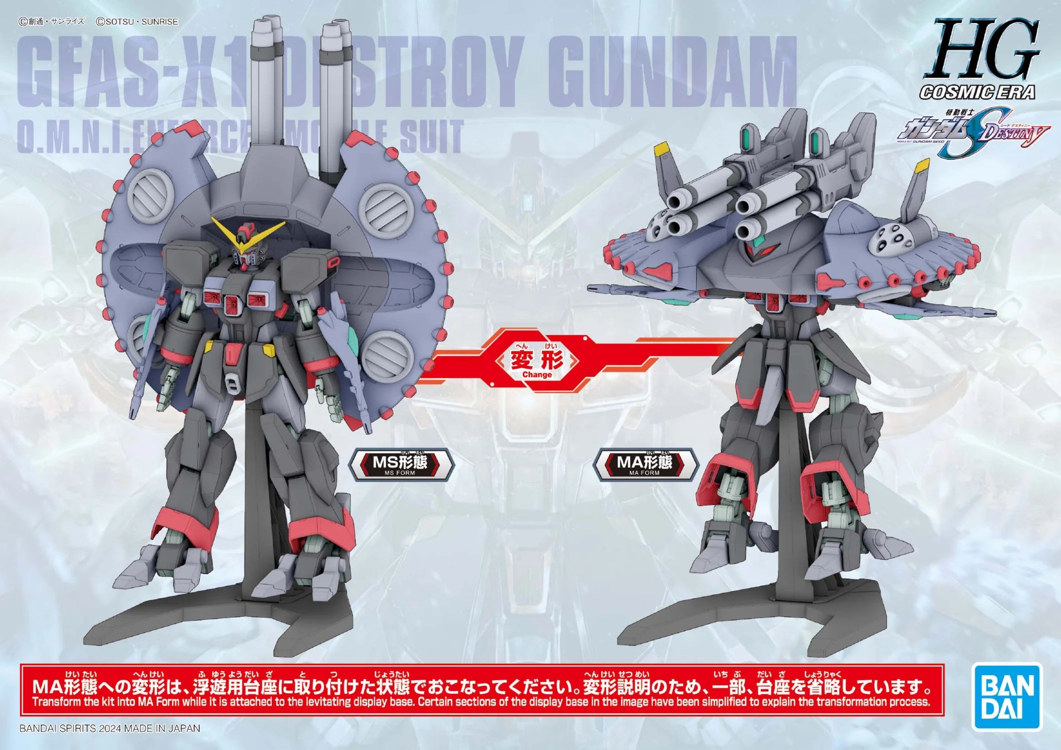 From the TV anime "Mobile Suit Gundam SEED DESTINY", the giant variable MS "Destroy Gundam" is three-dimensionalized in the HG series! This model kit includes interchangeable parts and accessories to create fun poses with. Be sure to add the Destroy Gundam to your collection!