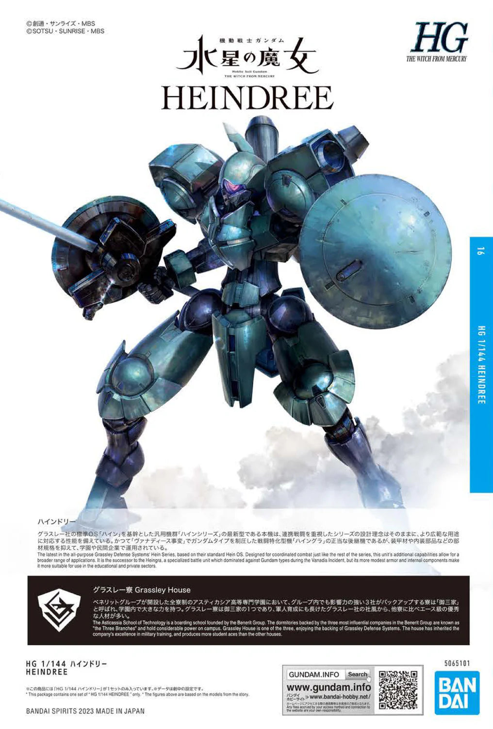 From the latest Gundam series Mobile Suit Gundam: The Witch of Mercury, Heindree is finally set to release! The ball joints in the neck and waist provide space and allows the model to tilt forward or back. Contains character specific weapon that is nearly as long as the model itself, along with a shield for the other arm.