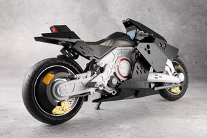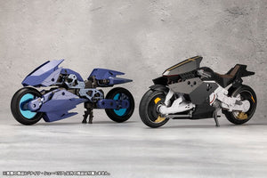 Designed using a different approach from the existing GIGANTIC ARMS RAPID RAIDER and BANDIT WHEEL, the frame has been kept simple with an emphasis on creating a detailed motorcycle. The motorcycle also feature hub-center steering, which is rare in real life, and allows the angle of the wheels to be adjusted. (There is no suspension.)