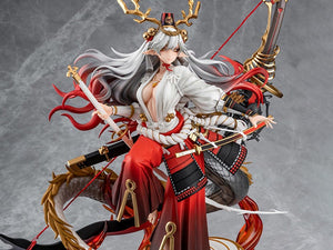 From the mobile game, Onmyoji comes a 1/4th scale figure of the character Suzuka Gozen. Dressed in their white and red outfit, Suzuka Gozen stands atop a rocky base covered in flame. The figure also features her giant bow strapped to her back as well as her many swords.