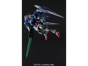 The 00 Raiser joins the highly detailed and complex PG series. The iconic twin GN drives are pre-assembled and feature both a powered light-emitting diode (LED) system and a motorized spinning gimmick that can be turned on and off. Eyes are also powered by an LED which can be turned on and off at will. Shoulders, elbows, wrists, and knees, have hidden clutch gimmicks behind the GN condensers to help hold poses due to the immense weight of the finished model kit. Detail of the inner skeleton features new styling complete with GN cables running throughout the body. Legs' swinging structures expand the movability. Fully equipped with beam sabers, AGN Sword III featuring translucent green plastic, and chromed plastic on the GN Sword II which can also double as rifles. Translucent pink blades are included for the GN swords and along with 4 original new weapons for the O Raiser support craft. O Raiser and 00 Gundam can successfully combine with latching mechanisms to form 00 Raiser.