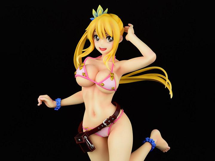 Lucy Heartfilia from "Fairy Tail" strikes a cute pose in her bikini swimsuit! Her beautiful figure is shown off to its best advantage, and the bracelets worn on her right wrist and left ankle match the blue in her hair ornament for a nice pop of color. Unlike Orcatoys' previous version, this Lucy comes with her long hair tied up in a side-ponytail, and her bikini is pink.