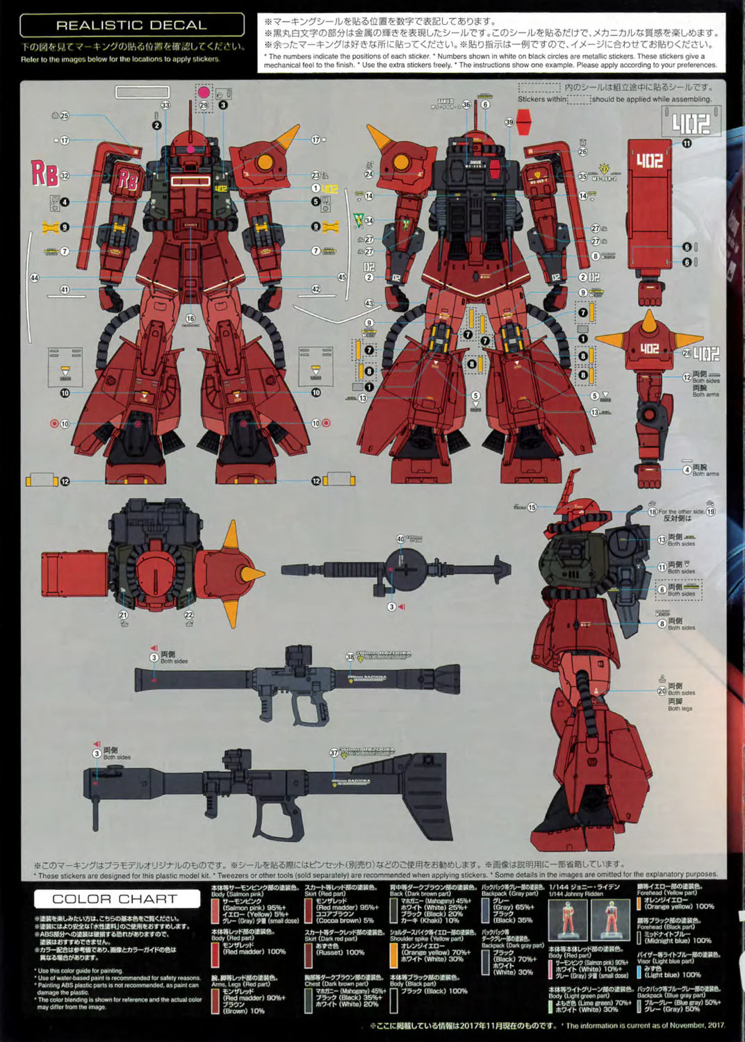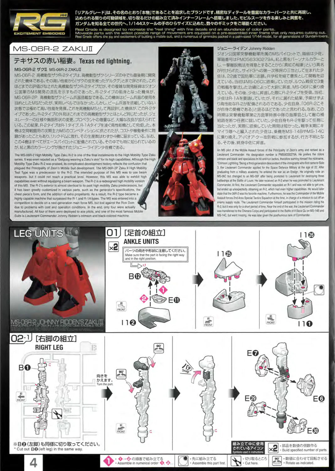 Johnny Ridden's Zaku II joins the RG line up as the first RG from the Mobile Suit Gundam MSV line and the first ever High Mobility Type Zaku as well. Its unique leg thrusters and backpack have been made with newly designed parts based on Kunio Okawara's illustrations including the 4 nozzle type bell vernier. Includes two shades of red on different parts of armor and stickers to recreate the markings on the Johnny Ridden Custom. Weapons include Giant Bazooka, Zaku Machine Gun, Heat Hawk, and regular bazooka along with numerous hand display options. Runner x 14, realistic decal, springs for energy pipes, instruction manual.