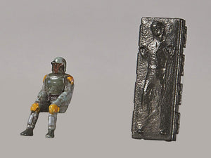 The highly detailed model kit comes with a Cloud City style display base, laser blast effect parts, two figures of Boba Fett (sitting and standing), a Han Solo in carbonite, parts for displaying the craft with its hatch open, and wing flap parts. It features a movable cockpit and wings.