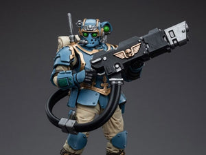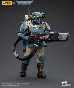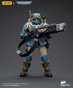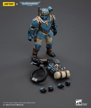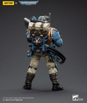 This is a 1/18 scale highly detailed, articulated figure based on Warhammer 40k's Hot-Shot Volley Gunner of the Astra Militarum Tempestus 55th Kappic Eagles. The Volley Gunner figure stands about 4.20 inches tall and comes with several interchangeable parts and accessories, opening the door to a plethora of different and unique display opportunities.